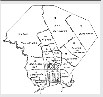 En 1916 la Ciudad estaba dividida en 20 circunscripciones electorales (Figura 1) y contaba con 1.610.594 habitantes; su superficie edificada era de 416.296 m2; la superficie pavimentada era de 11.432.651,44 m2; y las calles estaban iluminadas con faroles de gas, aunque todavía se usaban algunos faroles de kerosene y, en menor medida, de alcohol. Las vías del tranvía eléctrico tenían 803 km y las de subterráneo 13 km. En ese momento se construye el primer ferrocarril −destinado a cargas− entre Plaza Once y el puerto. En la Plaza Retiro se inaugura la Torre de los Ingleses, y principia el puente Victorino de la Plaza sobre el Riachuelo, uniendo la Ciudad con la Provincia de Buenos Aires.