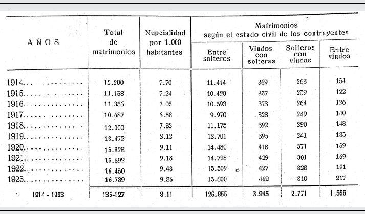 En los comienzos de la década, el número de uniones matrimoniales fue elevado en comparación con 1916, año en el se registraron 11.356 matrimonios y una tasa de nupcialidad de 7,1 matrimonios cada 1.000 habitantes (Cuadro 2). Esta tendencia descendente de la tasa de nupcialidad se observaría por algunos años más. Si bien más del 90% de los matrimonios se produjo entre contrayentes solteros, el 4,4% correspondió a uniones entre varones viudos y mujeres solteras y a uniones en las que ambos contrayentes se encontraban en situación de viudez. Estas cifras ya muestran la mayor reincidencia de los varones en la conformación de nuevas parejas, práctica característica de estos tiempos.