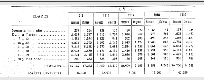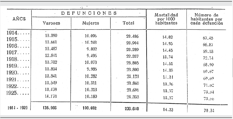 En 1916 se registraron 23.289 defunciones, observándose sobremortalidad masculina (Cuadro 3). En ese año, la tasa bruta de mortalidad fue de 14,5 por mil, siguiendo con el proceso de disminución que había comenzado en años anteriores. Es evidente que la mejora en el estado sanitario y las políticas de higiene pública contribuyeron a ese descenso. En relación con las causas de muerte, las enfermedades generales eran las que tenían más peso (7.275 muertes) y, dentro de estas, la tuberculosis pulmonar era la que generaba mayor número de defunciones (2.849 muertes). Le siguen en importancia las muertes causadas por enfermedades del aparato circulatorio (4.355 muertes) y las causadas por enfermedades del aparato respiratorio (3.413 muertes).