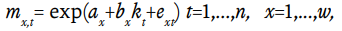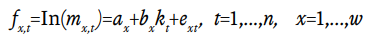 Al aplicar el modelo de Lee y Carter a tasas de mortalidad, las mismas se descomponen en dos parámetros a y b (también llamado base) y un índice kt que representa el nivel general de la mortalidad. La premisa básica del modelo es que existe una relación lineal entre el logaritmo de las tasas específicas de mortalidad mx,t y dos factores explicativos: el intervalo de edad, x , y el tiempo, t. La ecuación que describe esto es: