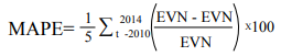 Con el fin de comparar la bondad predictiva de los distintos métodos propuestos, en una segunda etapa se eliminaron los datos de los últimos 5 años y se recalcularon las estimaciones de los pronósticos para, luego, mediante el coeficiente MAPE2 calcular el porcentaje de error cometido por cada modelo (Tabla 6).