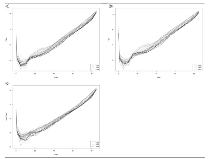 El primer paso para la aplicación de los modelos estadísticos (LC y MDF) es realizar un suavizado de las tasas observadas a través de los grupos etarios. Si bien, en principio, LC no requiere este suavizado, esto permite obtener una función suave de las edades y, a través de ellas, tasas para cada edad simple aunque los datos originales sean informados por grupos etarios.