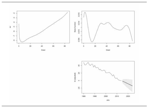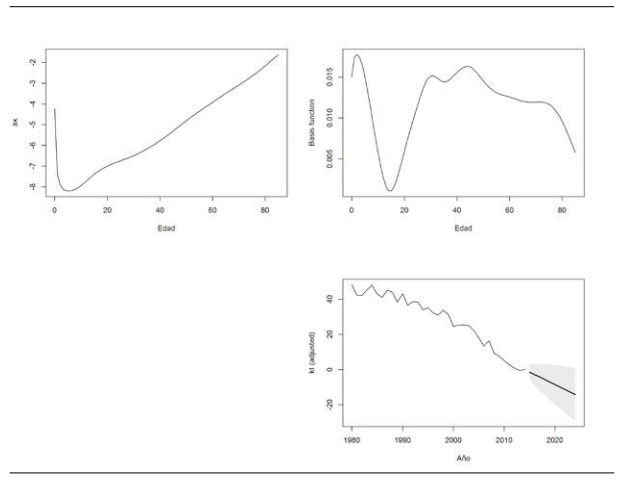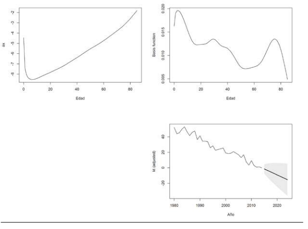 Con el fin de calcular los pronósticos, se predice el índice general mediante modelos para series de tiempo (los pronósticos se muestran en la Figura 1, kt con línea negra), y, suponiendo que el comportamiento del parámetro b permanece estable, se construyen los valores estimados de las tasas de mortalidad para años futuros. Para mayores detalles metodológicos, es posible consultar Lee y Carter (1992).