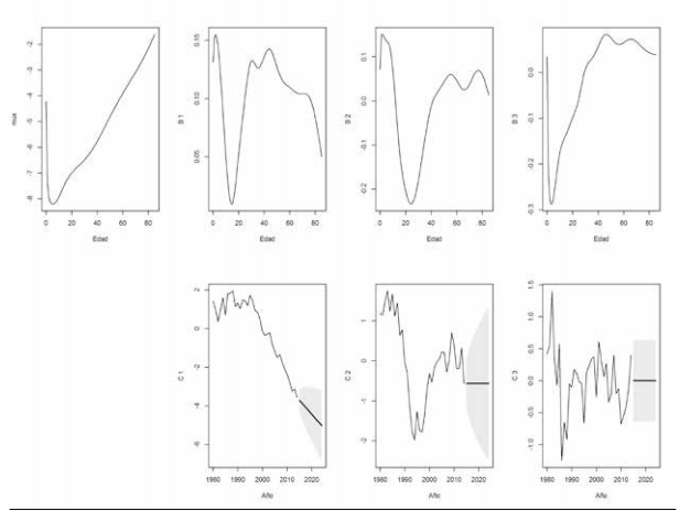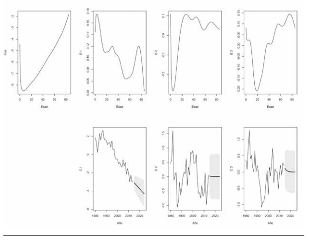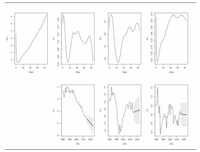 Posteriormente, a través de métodos de series de tiempo, se pronostica el índice general de mortalidad y, finalmente, se pronostican las tasas de mortalidad específicas por edad, tanto en forma puntual como por intervalos de confianza.