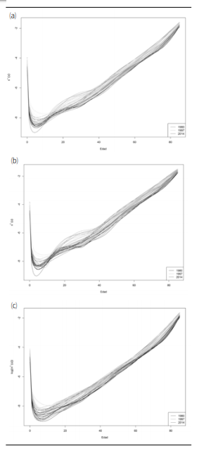 Por ejemplo, en el caso de la mortalidad del total de la población (Figura 3), el primer coeficiente muestra un decrecimiento de la mortalidad a través del tiempo (segunda columna), pero, para interpretarlo correctamente, este comportamiento debe ponerse en correspondencia con su base asociada (recuadro de la fila superior), ya que la misma indica en qué edades se manifiesta este descenso y con qué intensidad. En este caso, la media estimada representa el perfil promedio de la mortalidad a lo largo de la vida (obtenido como el promedio de las funciones a través de los años). Por otro lado, la primera base funcional indica que el decrecimiento se da especialmente en los primeros años de vida (mortalidad infantil y primeros años) y en menor medida para los mayores de 40 años. Sin embargo, ese decaimiento no es tan notorio para personas de alrededor de 20 años. Este hecho se refleja en la base, ya que la misma adquiere un valor cercano a cero para la mencionada edad.