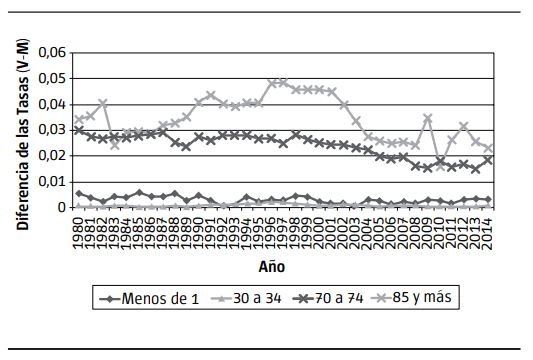 Los pronósticos realizados por los tres métodos (modelo LC, MDF, pronósticos Coherentes) no difieren sustancialmente; no obstante, esta última metodología mantiene la diferencia observada entre sexos en los pronósticos obtenidos. Por ejemplo, para el año 2020, con una confianza del 80%, se espera que la esperanza de vida para varones caiga en el intervalo de 73,98 a 75,96 años y para mujeres entre 80,35 y 82,25 años. Sin embargo, este supuesto puede ponerse en duda debido a los cambios culturales que hicieron variar el rol de mujer y su actividad en la vida laboral. Esto hace suponer, como ha sucedido en otros países, que la diferencia observada en las tasas de mortalidad y la EVN entre ambos sexos se va reduciendo, como muestra para la mortalidad la Figura 4.