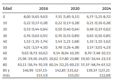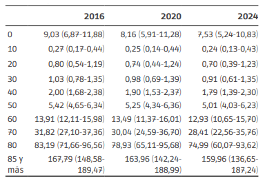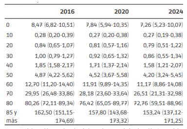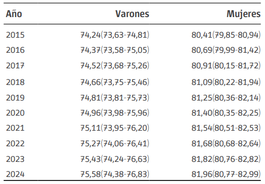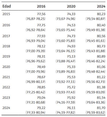 A partir de los pronósticos de las tasas de mortalidad, es posible obtener, a través del uso de tablas de vida, los pronósticos de las Esperanzas de Vida al Nacer. En este caso se presentan los valores hasta el año 2024 (Tabla 3).