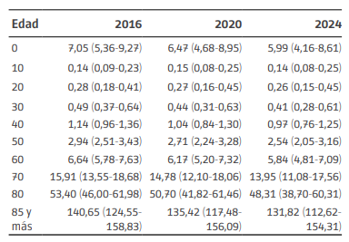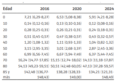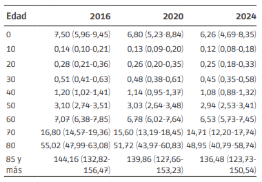En la Tabla 2 se presentan los pronósticos de las tasas de mortalidad. A modo informativo, se seleccionan edades y años; no obstante, las tasas se obtienen para edades simples y para el período 2015-2021. Si bien algunos pronósticos del índice kt presentan valores negativos, los pronósticos de la tasa de mortalidad, por la forma del modelo, como es lógico, son todos positivos.