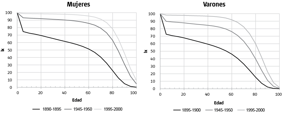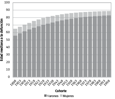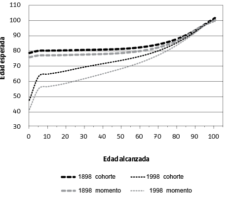 Mientras que la cohorte de 1898 fue más dependiente del contexto que predominaba en el momento de su nacimiento y pocos supervivientes estaban en condiciones de lograr eventuales mejoras que se produjesen años más tarde, en la cohorte de 1998 la gran mayoría de las defunciones serán postergadas al final a un momento alejado del nacimiento. En el Gráfico 8 se muestra que en la cohorte de 1898 la mayor parte de las defunciones se producían en los primeros años de vida; en la cohorte de 1998, en cambio, la mayoría de las defunciones se darán en la vejez.