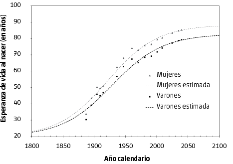 Mujeres: EVN(m) = 20 + 68,40/(1 + e – (0,0249t – 47.940))