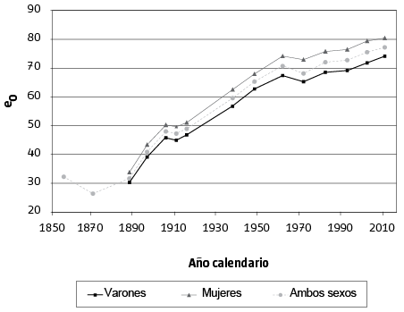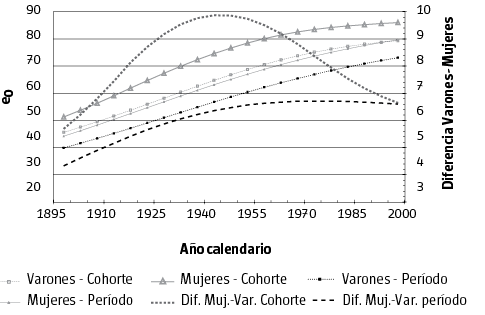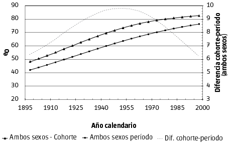 Si en lugar de prestar atención a las personas de distintas edades en un período determinado, observamos cohortes a lo largo de sus años, pueden re-interpretarse tanto el proceso de envejecimiento demográfico como los efectos de la EVN sobre las edades avanzadas. Al colocar el análisis de la mortalidad desde una mirada longitudinal y de muy largo plazo (más de dos siglos), se produce un desplazamiento de los núcleos de interés donde, en lugar de preguntas sobre los efectos previsibles del cambio en la estructura por edades de la mortalidad, se pasa al perfil peculiar que cada cohorte posee al llegar a edades avanzadas (Pérez Díaz, 2001).