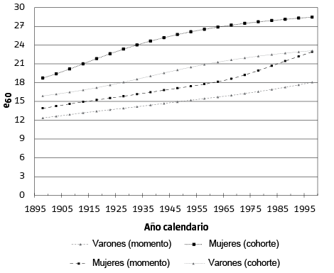 La esperanza de vida de período a la edad 60 (edad aproximada de retiro) presenta un crecimiento casi lineal desde fines del siglo xix hasta fines del siglo xx, con brechas crecientes para mujeres. En cambio, los resultados desde la óptica longitudinal revelan valores muy por encima de los de período: a fines del siglo xix las distancias son menores, pero hacia 1998 llegan a casi 6 años de diferencia, tanto para mujeres como para varones. Las brechas entre los sexos estimadas por cohorte son mayores que las de período, con distancias cada vez más grandes hasta mediados del siglo xx, reduciéndose gradualmente a posteriori.