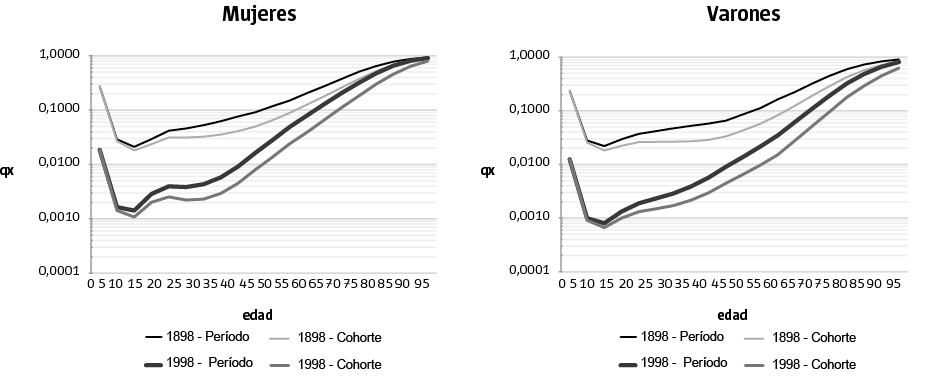 Al observar la tendencia de las probabilidades de morir por edades y sexo según cohorte y período entre 1898 y 1998 (Gráfico 7), se advierte que su descenso relativo ha sido más alto para las mujeres que para los varones y en todas las edades más alto longitudinalmente. Las diferencias entre cohortes reales y ficticias aumentan notablemente entre los 20 y 70 años de edad en la cohorte de 1898 y entre los 15 y los 90 años en la cohorte de 1998, algo más en las mujeres. Esto se vincula con el hecho ya señalado de que el diferencial de mortalidad ha aumentado entre los sexos, si bien en todas las edades, mucho más acentuado por sobre los 40 años de edad desde el punto de vista transversal.