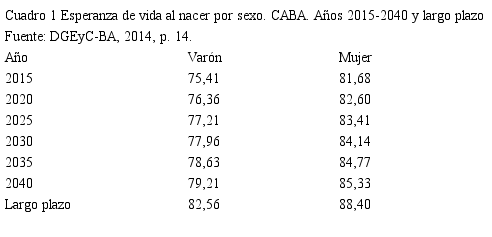 En segundo lugar, fueron necesarias proyecciones de EVN que abarquen la tendencia hasta el fin de la vida de las cohortes contemporáneas: el futuro fue definido de acuerdo con las EVN proyectadas por la Dirección General de Estadística y Censos de la CABA (DGEyC BA, 2014, p. 14) para el período 2015-2040 y el límite supuesto en el largo plazo (Cuadro 1).