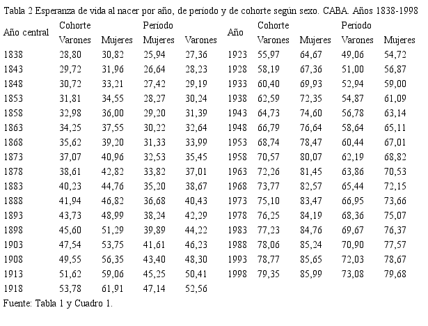 Al utilizar una forma alternativa de observación de la EVN, bajo la adopción de diversos supuestos sobre el comportamiento futuro y pasado de la mortalidad por edad, ilustrado con dos cohortes en particular, se descubrió que, en la experiencia de la mortalidad de las personas nacidas en los años 1898 y 1998, los valores de cohorte resultan 6 años por encima de las estimaciones de período. A medida que desciende la mortalidad, las brechas entre los datos de cohorte y de período se hicieron mayores hasta la cohorte de 1958, cuando las diferencias comienzan una tendencia descendente. La CABA mantiene una diferencia muy alta en la EVN por sexo, creciente a medida que transcurren las décadas, pero prácticamente similar en la cohorte de 1998. Se descubrieron, a su vez, considerables diferencias en la esperanza de vida a distintas edades, tanto por sexo y por cohorte (mayores en 1998), como según tipo de observación (longitudinal, transversal).