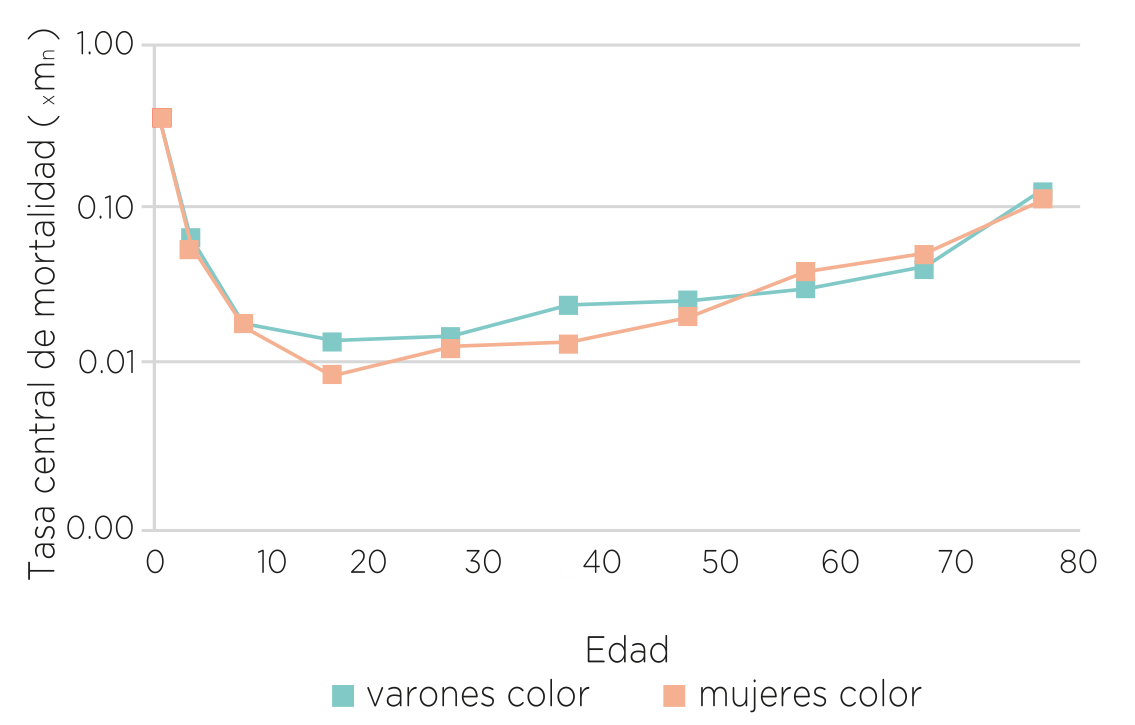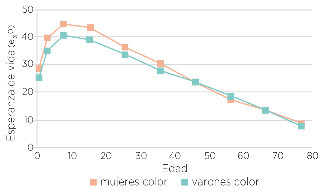 Para este trabajo hemos realizado también las tablas de mortalidad por sexo y grupo socio-étnico; no obstante, la reducida cantidad de casos en algunos grupos de sexo y edad y las oscilaciones observadas en los datos obtenidos nos hacen dudar su fiabilidad (especialmente entre la población de “color”). De todas maneras, nos parece un interesante ejercicio metodológico y que resulta útil, al menos, para poder entrever algunas tendencias. Es por eso que incluimos este apartado en el que se presentan y se analizan las tablas de mortalidad por sexo y grupo socio-étnico.