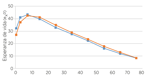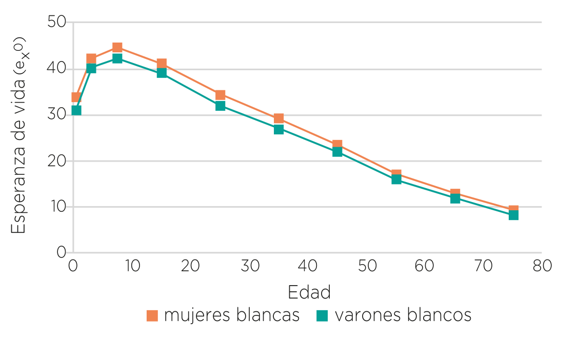 A pesar de lo mencionado en el párrafo anterior, al revisar las tablas de mortalidad por sexo y grupo socio-étnico (Cuadros A.1 a A.4), los resultados obtenidos resultan bastante consistentes: la esperanza de vida al nacer es mayor entre las mujeres (mujeres “blancas” e0=33,7; mujeres “de color” e0=28,6) que entre los varones (varones “blancos” e0=30,8; varones “de color” e0=25,4). Las diferencias ante la muerte entre hombres y mujeres también están dentro de lo esperable, en este caso observamos una sobremortalidad masculina en la esperanza de vida al nacer de 2,9 años entre la población “blanca” y 3,2 años entre la población “de color”. De hecho, es posible observar la sobremortalidad masculina en ambos gráficos de esperanza de vida (Gráficos A.3 y A.4).