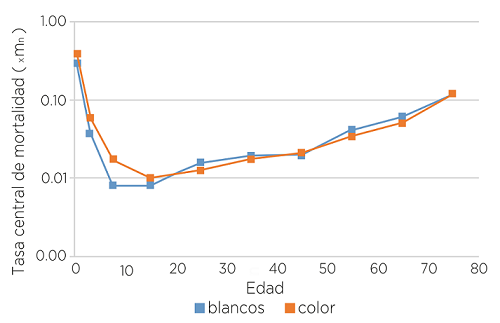 Al observar los gráficos de esperanza de vida y tasa central de mortalidad por edad (Gráficos 1 y 2), se puede vislumbrar que la población “blanca” tiene mayor esperanza de vida y menor mortalidad en los primeros años de vida. En la población “de color”, por el contrario, se observa una mayor esperanza de vida y menor mortalidad que la población “blanca” a partir de las edades adultas. En cierto modo, pareciera que opera una suerte de “selectividad” en la población “de color”, a través de la cual la población que supera el período crítico de 0 a 10 años, sería más resistente y gozaría de mejor salud. Esta situación se observa perfectamente en la sobrevida de la población “de color” a partir de los 15 años (Gráfico 2).