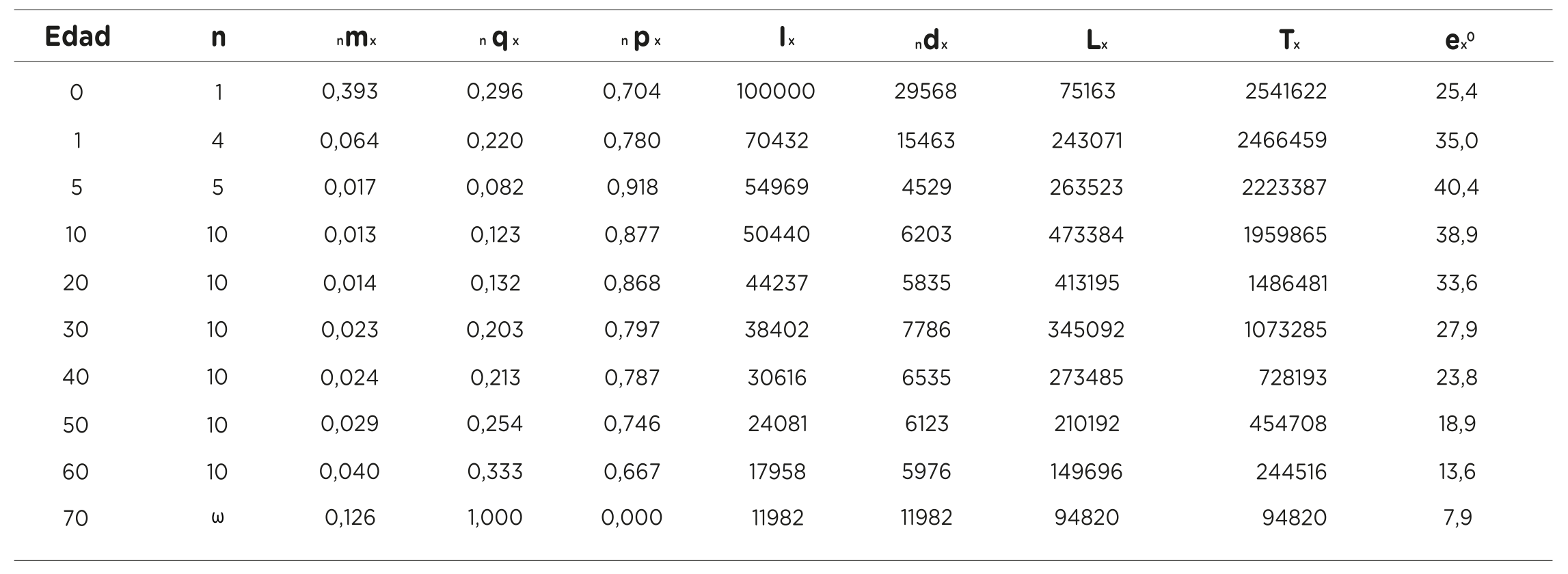 Tanto al observar las tasas brutas de mortalidad, como los resultados provistos por las tablas de mortalidad, nos encontramos con resultados consistentes sobre los niveles y la estructura de la mortalidad. A nivel general, estas estimaciones abonan la caracterización de una sociedad pretransicional marcada por una mortalidad elevada y con fuerte peso de los decesos infantiles. Es de destacar la caída en la probabilidad de morir y el aumento de la esperanza de vida, en las edades de 1-4 y 5-9. Si bien resulta esperable que la mayor ganancia en esperanza de vida se produzca luego del primer año de vida, los valores que manejamos resultan bastante más elevados que en las tablas de mortalidad actuales, lo cual nos da una pauta de lo crítico que resultaba el primer año de vida en una sociedad del Antiguo Régimen Demográfico (Dmitruk y Guzmán, 2019, pp. 14-15).