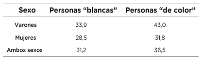 En cuanto a las diferencias raciales, constatamos que la población “de color” sufría una mortalidad más alta que la población “blanca”. La tasa bruta de mortalidad es mayor, con una divergencia significativa, entre los grupos “pardos”, “morenos”, “negros”, y otros que entre los clasificados como “blancos”. Por otro lado, la esperanza de vida al nacer es superior entre la población “blanca” (e0=32,0) que entre la población “de color” (e0=27,2).