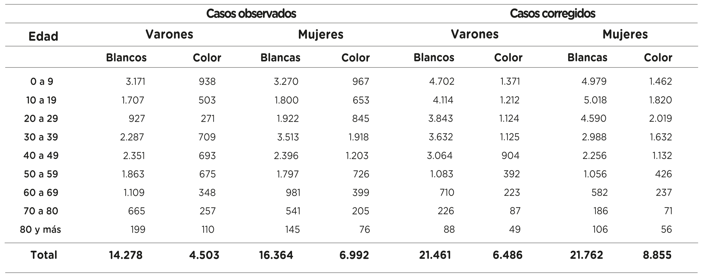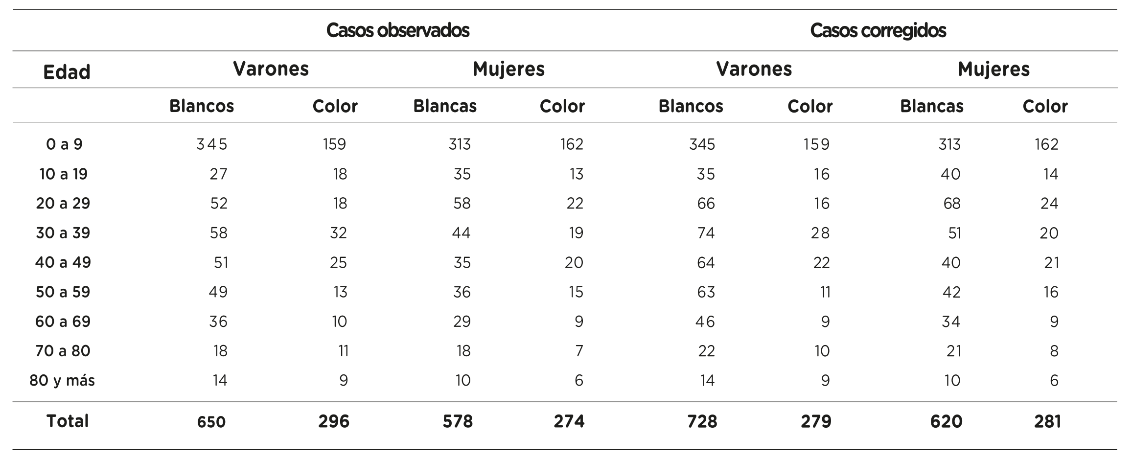 En el Cuadro 1, anotamos los números totales de la población observados en el censo y los corregidos según los ajustes previamente explicados. Por medio de los diferentes procesos de ajustes, se cuenta con los datos de la población por sexo, edad y grupos “blancos” y “de color”. Es momento de analizar el siguiente componente: la cantidad de muertes.