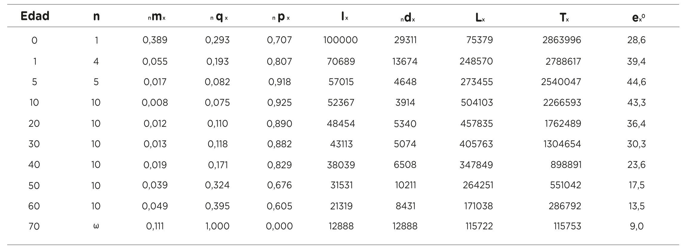 La tabla de mortalidad tiene como fin el cálculo de la esperanza de vida9, pero también permite evaluar diversos indicadores relacionados con la mortalidad de una población. El mecanismo consiste en utilizar una cohorte hipotética de 100.000 personas a la cual se la someterá a las condiciones vigentes de mortalidad, en nuestro caso, las condiciones determinadas por el contexto de salud y condiciones de vida de la Ciudad de Buenos Aires alrededor de 1827.