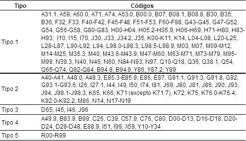 Tipo 5: causas de defunción “mal definidas” que la Organización Mundial de la Salud reconoce formalmente como códigos poco útiles. Se trata de todas aquellas causas agrupadas en el capítulo R; es decir, todas las causas cuyo código comienza con la letra R.