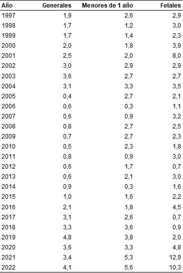 Por último, en la comparación 2021-2022, la participación de las causas mal definidas aumenta tanto en las defunciones generales como en las defunciones de menores de un año: en las primeras, 0,7 puntos porcentuales y, en las segundas, 0,3 puntos porcentuales. En las defunciones fetales, en tanto, disminuye 2,6 puntos porcentuales.