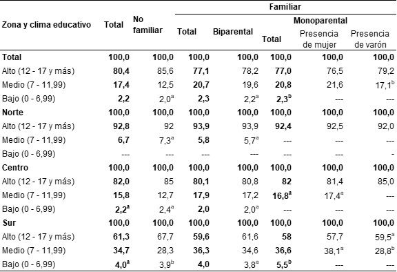 En resumen, se puede destacar que la zona de residencia refleja las mayores diferencias en el clima educativo de los hogares, acentuándose las desventajas de los hogares monoparentales del sur de la Ciudad.