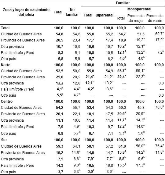 En segundo orden de importancia, para el total de la Ciudad, los hogares monoparentales de procedencia limítrofe y del Perú superan a los de “Otra Provincia”. Esta desagregación presenta debilidad por los altos coeficientes de variación, sobre todo en la Zona Norte. No obstante, del análisis comparativo entre zonas surge que el Sur y, en menor medida, la Zona Centro explican el mayor peso de los hogares de procedencia limítrofe y del Perú dentro de los monoparentales encabezados por mujeres, donde representan la 2ª y 4ª procedencia (17,3 y 14% respectivamente).