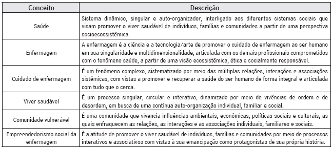Inicialmente, foram realizados estudos e aprofundamentos coletivos sobre as interconexões sistêmicas entre os diferentes conceitos, baseados no referencial da complexidade e, a seguir, cada integrante do grupo de pesquisa elaborou o seu conceito sobre saúde, enfermagem, cuidado de enfermagem, viver saudável, comunidade vulnerável e empreendedorismo social em enfermagem. Posteriormente, os conceitos foram discutidos e ampliados coletivamente nos diferentes núcleos de estudo, mediante o exercício da reflexividade, ou seja, foram discutidos pelos núcleos de docentes, discentes, bolsistas e profissionais enfermeiros inseridos nos cenários de prática, em aproximadamente 15 encontros. E, por último, a validação se deu a partir do consenso do grande grupo em seminários ampliados de pesquisa do Gepeses, reconhecidos como adequados e pertinentes por meio da compreensão dos sujeitos envolvidos nessa construção, como também submetidos à apreciação de pesquisadores de outros centros de pesquisa. Quadro 1.