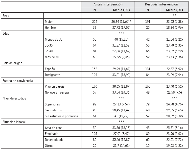 Las variables predictoras fueron el sexo, el país de origen (España u otro), el nivel de estudios (superior, secundario y primario o sin estudios), la situación laboral (trabaja, desempleado, tareas del hogar u otros), el estado de convivencia (en pareja o no) y la edad (menos de 30, 30-35, 36-40 y más de 40). En el análisis multivariado la variable dependiente fue la diferencia entre estrés pos y preintervención. La variable fue dicotomizada tomando como punto de corte la mediana de la distribución.