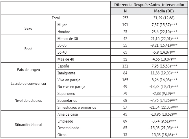 La tabla 1 muestra los resultados descriptivos y del análisis bivariado comparando los diferentes grupos. Se identificaron diferencias significativas en los niveles de estrés antes de la intervención en cuanto al sexo, el nivel de estudios, la situación laboral y la edad. Por el contrario, tan solo se vieron diferencias significativas en el nivel de estrés después de la intervención en cuanto sexo y nivel de estudios. En la tabla 2 se presenta la reducción del nivel de estrés parental tras la participación en la intervención. El análisis bivariado identifica que el estrés se redujo de forma significativa para todas las categorías de las variables predictoras.