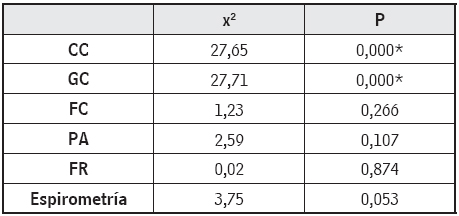 Respecto a las asociaciones entre los parámetros antropométricos (IMC, CC y GC) y cardiopulmonares, se encontró que el IMC tiene una relación directa con el riesgo de sufrir comorbilidad de acuerdo con la CC (x2 = 27,65; p < 0,000) y la GC (x2 = 27,71; p < 0,000). Se encontró una significancia marginal entre el IMC y la espirometría (x2 = 3,75; p < 0,053). En contraste, no se halló una relación significativa entre el IMC y los demás parámetros cardiopulmonares (FC, PA y FR). Todos estos valores se pueden apreciar en la tabla 2.