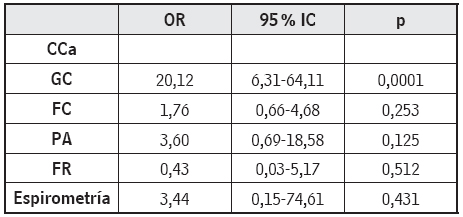 Se halló para anormalidad en la FC un OR = 1,76, para PA un OR = 3,60 y en los resultados espirométricos un OR = 3,44; sin embargo, estas últimas asociaciones entre variables no resultaron estadísticamente significativas. La relación entre el IMC con la valoración de la CC (con riesgo/sin riesgo de morbilidad) no se calculó debido a la inexistencia de casos en alguna de las casillas en la tabla de contingencia antes del cálculo del OR.