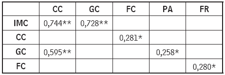 En la tabla 4 se comprueban las relaciones entre variables, observándose una alta correlación entre el IMC con la GC (rs = 0,728; p < 0,01) y el riesgo de desarrollar comorbilidades por CC (rs = 0,744; p < 0,01). También se encontró relación entre la GC y el riesgo de desarrollar comorbilidades por la CC, siendo esta una correlación media significativa (rs = 0,595; p < 0,01).