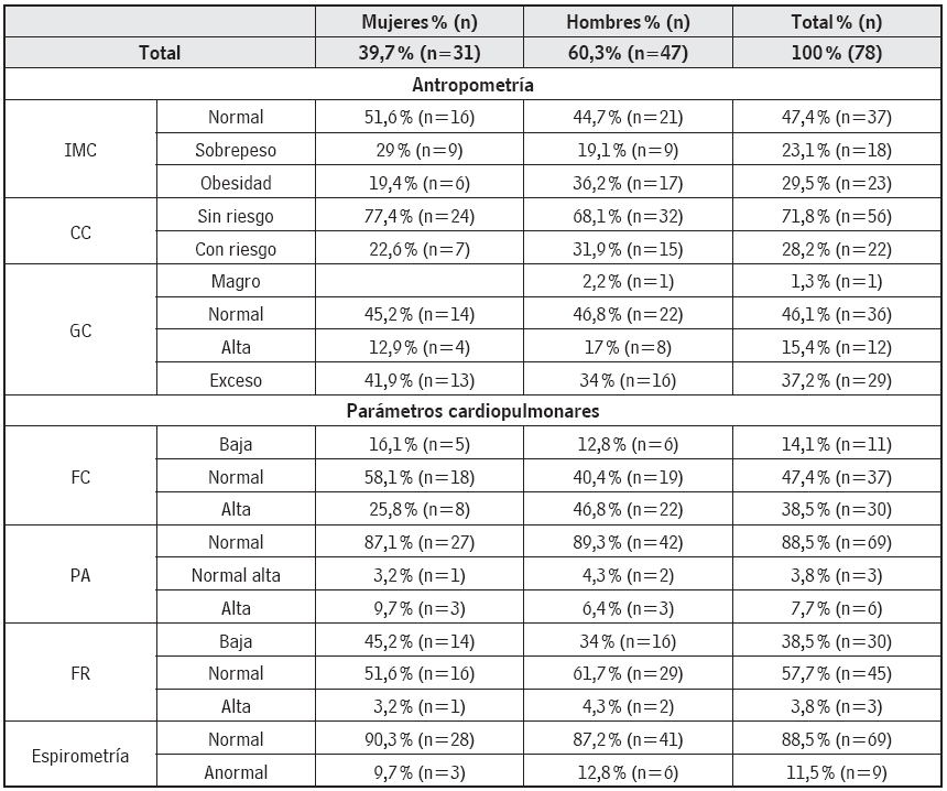 A fin de valorar la relación entre las variables antropométricas (IMC, CC y GC) y los parámetros cardiopulmonares (FC, PA, FR y espirometría), se realizó un análisis mediante las pruebas de chi-cuadrado (X2), odds ratio (OR) y coeficiente de Spearman (rs), utilizando el paquete estadístico SPSS, versión 22.0 para Windows®.