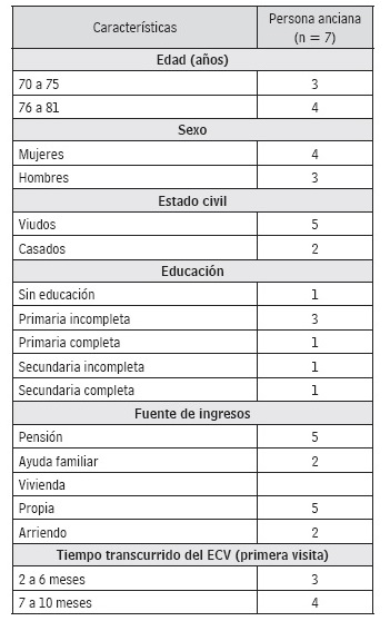 En la tabla 1 se indican las características de los adultos mayores con ACV participantes en el estudio. La edad se encontraba entre los 70 a 81 años, en su mayoría mujeres viudas, con primaria incompleta, que recibían un ingreso mensual proveniente de una pensión, con vivienda propia y el tiempo transcurrido del ACV entre 2 a 10 meses. Solo un colaborador se definió como de religión protestante, los demás se declararon católicos.