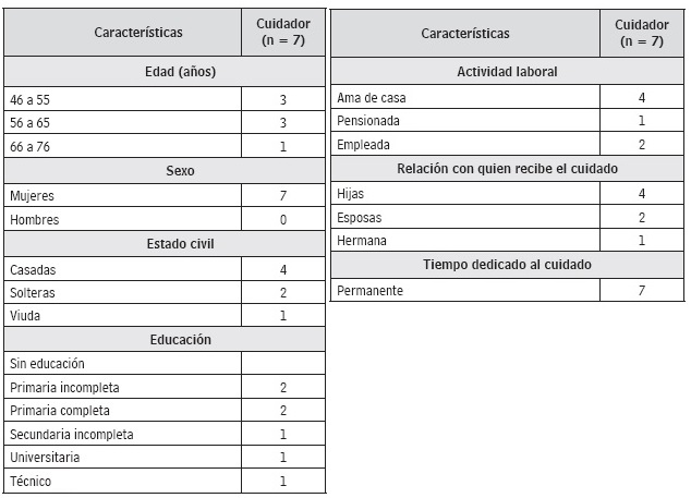 La tabla 2 muestra las características de los cuidadores de los adultos mayores con accidente cerebrovascular. La edad se encontraba entre los 46 a 76 años, todas mujeres, la mayoría casadas, con escolaridad de primaria y 2 con estudios superiores de nivel técnico y universitario, quienes desempeñaban el principal rol de ama de casa, casi todas hijas del adulto mayor con ACV, con dedicación permanente al cuidado del mismo.