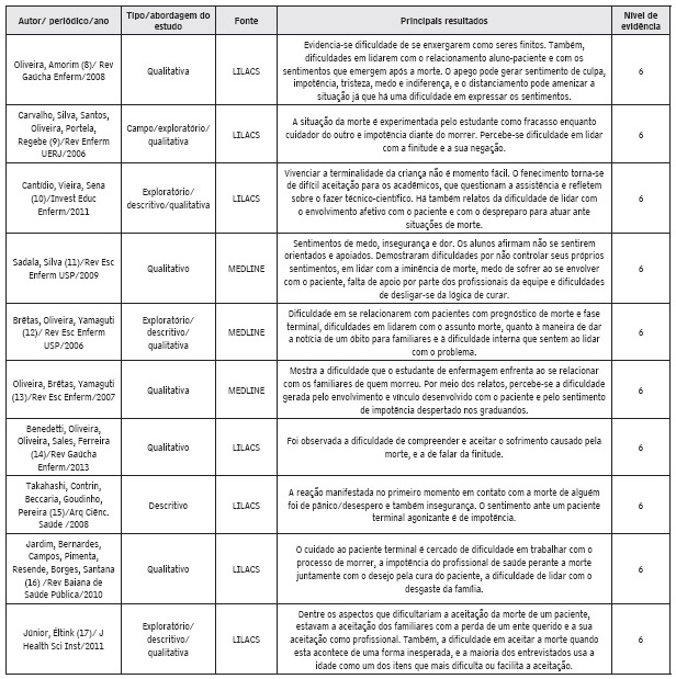 Salienta-se que foram alcançados os objetivos de revisão aqui propostos. Foi possível identificar as evidências disponíveis na literatura, no que se refere às dificuldades enfrentadas e aos sentimentos manifestados por graduandos de Enfermagem diante de situações relacionadas com a morte e o morrer de pacientes hospitalizados.