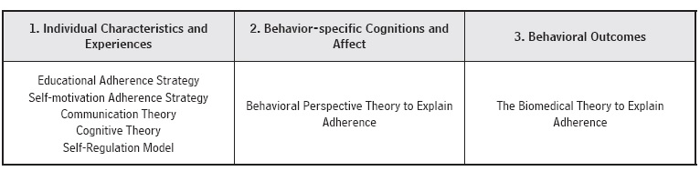 HIV treatment effectiveness is based on the level of patient adherence to the therapeutic regimen. Health care systems, HIV-treatment team members, and patients all have a responsibility in improving adherence to medication. A single technique is not able to improve the adherence of HIV patients to a therapeutic regimen. Instead, the development and implementation of diverse methods focused on improving adherence is needed. Table 1 presents the different theories and models that have been applied to explore adherence behaviors. These theories and models are grouped under the three major components of the HPM: Individual Characteristics and Experiences, Behavior-specific Cognitions and Affect, and Behavioral Outcomes. These models could be implemented within the HPM framework by team members, with the overarching goal of improving adherence to scheduled medical appointments and daily medications.