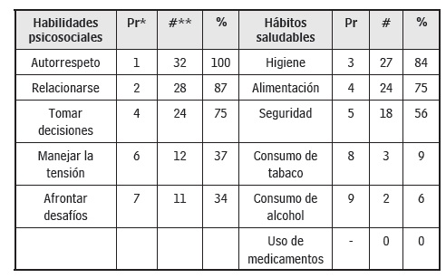 En los resultados obtenidos por otros grupos que han trabajado con habilidades para la vida como Morales, Benítez y Agustín (23) se encontraron algunas diferencias con la presente investigación; dicho grupo reportó mejores resultados al trabajar primero las habilidades sociales básicas y las relacionadas con los sentimientos, y dejar para más adelante las habilidades cognitivas: "para que existan las segundas deben desarrollarse y fortalecerse las primeras". De igual manera, recomendaron realizar intervenciones más prolongadas y profundas para el desarrollo de las habilidades cognitivas, que son más complejas, requieren mayor experiencia, madurez para lograrlas, y deben partir de la transformación de creencias arraigadas en los individuos, en lo cual coinciden Morales, Benites y Agustin (23). Es importante seguir investigando sobre la efectividad del trabajo en habilidades para la vida, insistiendo en que el análisis de las tres categorías por separado posiblemente permita una mejor comprensión de todos los elementos que se ponen en juego cuando se trata de aprender, desaprender y reaprender formas de pensar, manejar emociones y ejecutar acciones; posiblemente, estos procesos son diferentes en la facilidad de su comprensión y enseñanza, por ejemplo, si se trata de habilidades sociales o si se trata de manejar emociones.