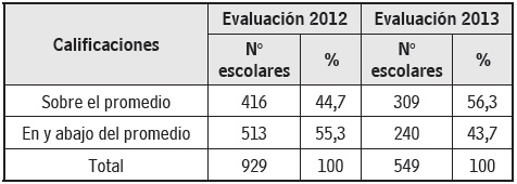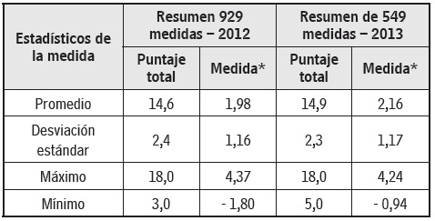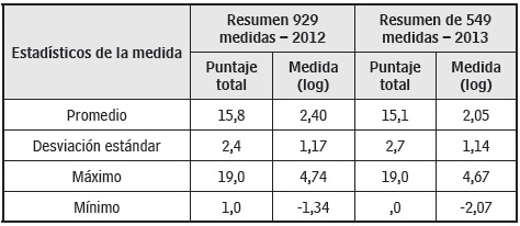 Los resultados de las medidas en la primera y segunda evaluación se mantuvieron estables; el promedio subió 0,18 lógitos indicando que más escolares tuvieron mejores calificaciones en la segunda evaluación. Ahora bien, para encontrar la proporción de estudiantes que mejoraron, se identificaron quienes estaban por encima del promedio en cada evaluación y, apoyados en el mapa de Wright generado por Winstep, se calculó el porcentaje siendo mayor en 11,6% para 2013 (tabla 3).