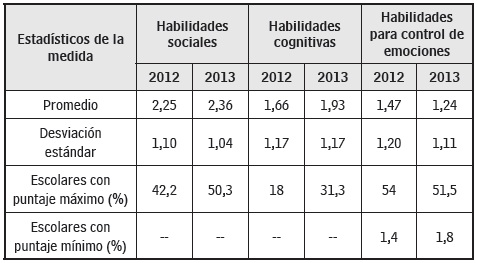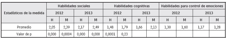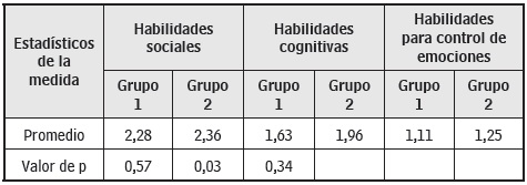 Las habilidades cognitivas fueron las de mayor cambio positivo en el grupo de escolares (0,27), seguidas de las habilidades sociales (0,11); las habilidades para el control de emociones retrocedieron en 0,23 entre la primera y la segunda evaluación.