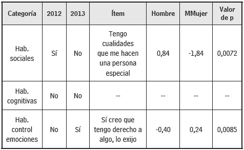 Funcionamiento diferencial del ítem FDI por sexo: se presenta cuando dos grupos comparables tienen una probabilidad distinta de responder con éxito en función del grupo al que pertenecen (21). En la primera evaluación se encontró un ítem con FDI más fácil de responder por las mujeres, y en la segunda evaluación otro más fácil de responder por los hombres. En los dos casos se observa la carga semántica de las palabras utilizadas, las cuales condujeron a respuestas diferentes (estadísticamente significativas) influidas culturalmente por el sexo de quien respondió. Estos ítems fueron excluidos de la base de datos antes de pasar al análisis de resultados en habilidades psicosociales para la vida por sexo.