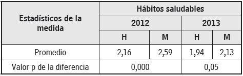 Hábitos saludables por sexo: la comparación de promedios de Rasch entre la primera y la segunda evaluación indican una disminución en la medida de hábitos saludables para ambos sexos en 2013; sin embargo, al buscar la significancia estadística de las diferencias se encontró que las mujeres obtuvieron resultados superiores y estadísticamente significativos para ambos años (tabla 9).