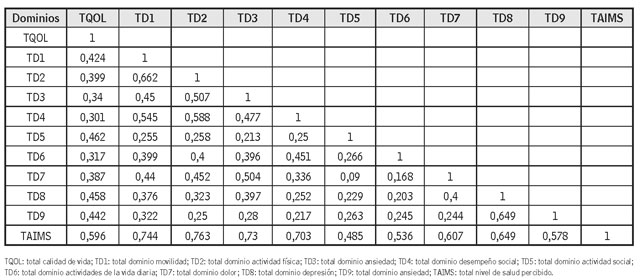 La correlación positiva y estadísticamente significativa entre los dominios de actividad física y movilidad 31, así como en la calificación total de nivel de salud con los dominios de actividad física, movilidad, destreza y desempeño, está acorde con los resultados del estudio EPISER 2000 en España, con 2192 participantes, en el que se evidenció la asociación positiva entre los dominios de actividad física, movilidad y la capacidad para trabajar 32-34. Por otro lado, se observó que la variable sociodemográfica de ser mujer reduce significativamente el nivel promedio de calidad de vida y de nivel de salud con respecto a ser hombre. Este hallazgo se complementa con lo reportado por Pease et al.35, en el que ser mujer se asocia a presentar incapacidad funcional 4 años después del comienzo de la enfermedad (OR = 3,0).
