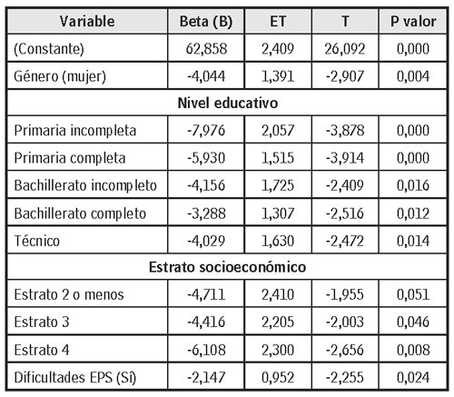 También se evidenció que la variable sociodemográfica de género, en la característica ser mujer, reduce significativamente el nivel promedio de calidad de vida en -4,116 puntos (valor Beta) y el de nivel de salud en -19,83 puntos con respecto a ser hombre. En el análisis de regresión múltiple se encontró que ser mujer predice un nivel bajo de calidad de vida con respecto a ser hombre -17,413, el pertenecer a un estrato igual o inferior a cuatro reduce significativamente el nivel de calidad de vida en comparación con pertenecer a un estrato igual o superior a cinco. Al analizar al interior de los estratos se observó que estas diferencias se acentúan cuando se compara el estrato dos o menos con el estrato cinco o más: 28.859. En cuanto a la escolaridad, tener una escolaridad menor o igual a bachillerato se asocia con una reducción en la calificación promedio de la calidad de vida respecto de tener algún grado de educación superior (técnico, universitario y posgrado); esta diferencia se acentúa en las personas con un nivel de educación básica o menos -31,655. Asimismo, presentar dificultades con la EPS reduce el nivel de calidad de vida respecto a las personas que manifestaron no tener dificultades con la EPS -13,494.