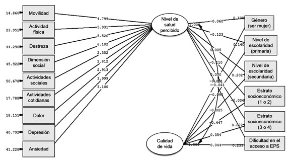 La correlación moderada observada bivariadamente entre los constructos nivel de salud percibido y calidad de vida tiende a diluirse en el modelo teórico planteado. Esto llamaría la atención para estudiar de forma separada los constructos y de esta forma extraer las variables más significativas sin asumir relaciones causales a priori. Al advertir el comportamiento de las variables sociodemográficas planteadas en el modelo teórico propuesto se encuentra que ser mujer afecta tanto el nivel de salud percibido como la calidad de vida observada; el pertenecer a un estrato menor o inferior al 1 o 2 afecta de manera negativa el NSP y la CV, y tiende a diluirse el efecto negativo observado en las personas pertenecientes a los estrato 2 y 3 sobre la salud y la calidad de vida percibidas; haber cursado estudios de primaria o poseer máximo este nivel de formación afecta de manera negativa el NSP y la CV. Las dificultades percibidas con el acceso a las EPS no se confirmaron en la propuesta teórica expuesta, hecho que exigiría a futuro un análisis a profundidad con el fin de verificar si esto se debe a problemas de tipo estadístico o a posibles correlaciones aún no observadas dentro del modelo propuesto.