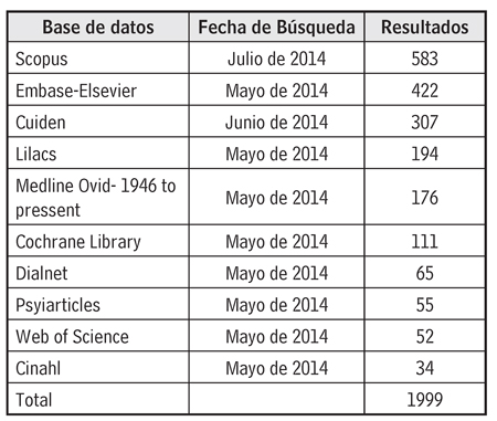 Las bases de datos incluidas fueron: Medline-Ovid, Embase-Elsevier, Cochrane Library, Cinahl, Dialnet, Lilacs, Web of Science, Psyiarticles, Cuiden y Scopus (tabla 1). No se usaron filtros por año, ni se hizo búsqueda de documentos no publicados.